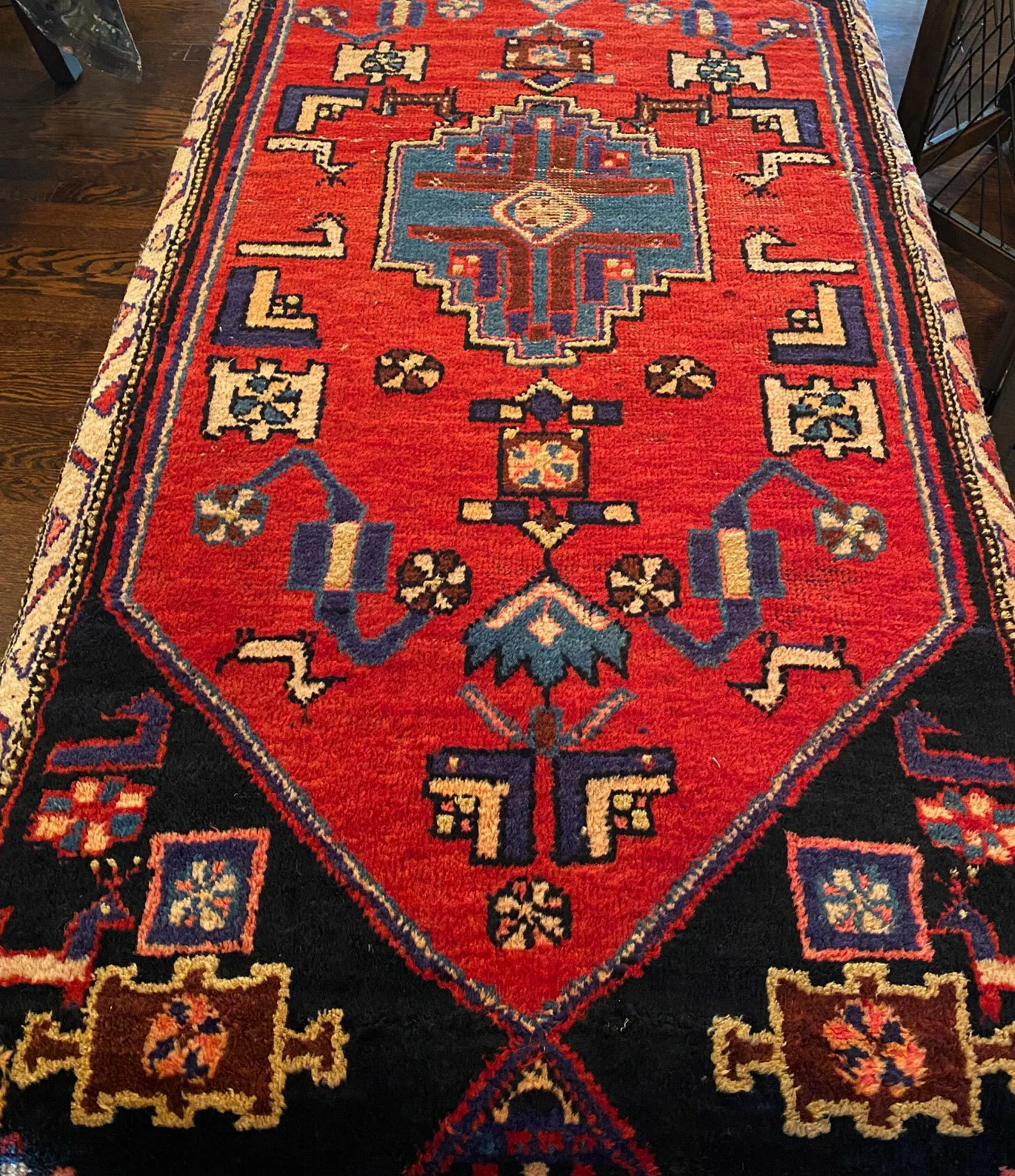 Description: Red, black, blue, cream, and large // To reserve or purchase this ottoman email us here or call us here.